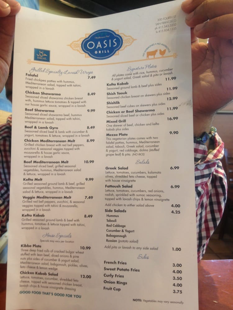 Introducing Oasis Grill, a Mediterranean gem located in San Francisco, offering a variety of fresh and flavorful dishes. The menu at Oasis Grill includes gourmet fresh salads like the Chicken Kebab Salad and Greek Salad, along with grilled specialty Lavash wraps such as the Beef and Lamb Gyro Wrap and Falafel Wrap. The Signature Plates like the Kefta Kebab Plate and Fish and Chips Plate are sure to satisfy your cravings. Customers rave about the authentic flavors, friendly service, and generous portion sizes. The casual yet vibrant ambiance, along with options for outdoor seating, make Oasis Grill a perfect spot for lunch or a quick bite. With a wide range of vegetarian and vegan options, this restaurant caters to diverse tastes. Experience the taste of Mediterranean cuisine at Oasis Grill, where every dish is made with care and passion.