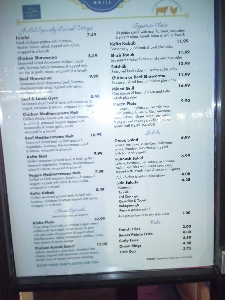 Seasoned sliced shawarma beef, hummus, Mediterranean salad, falafel balls, topped with tahini, wrapped in lavash.